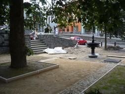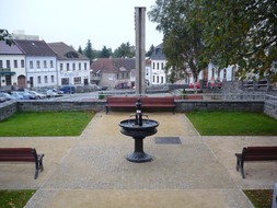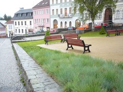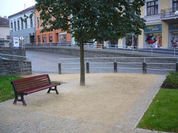 Řešení Dolního náměstí v Humpolci včetně parku s kamennými opěrnými zdmi a schodišti je dílem významného českého architekta Josefa Gočára (1880-1945).